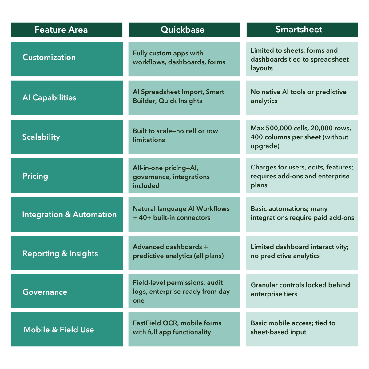 Here’s how Quickbase and Smartsheet stack up in the areas that matter most for modern operations.