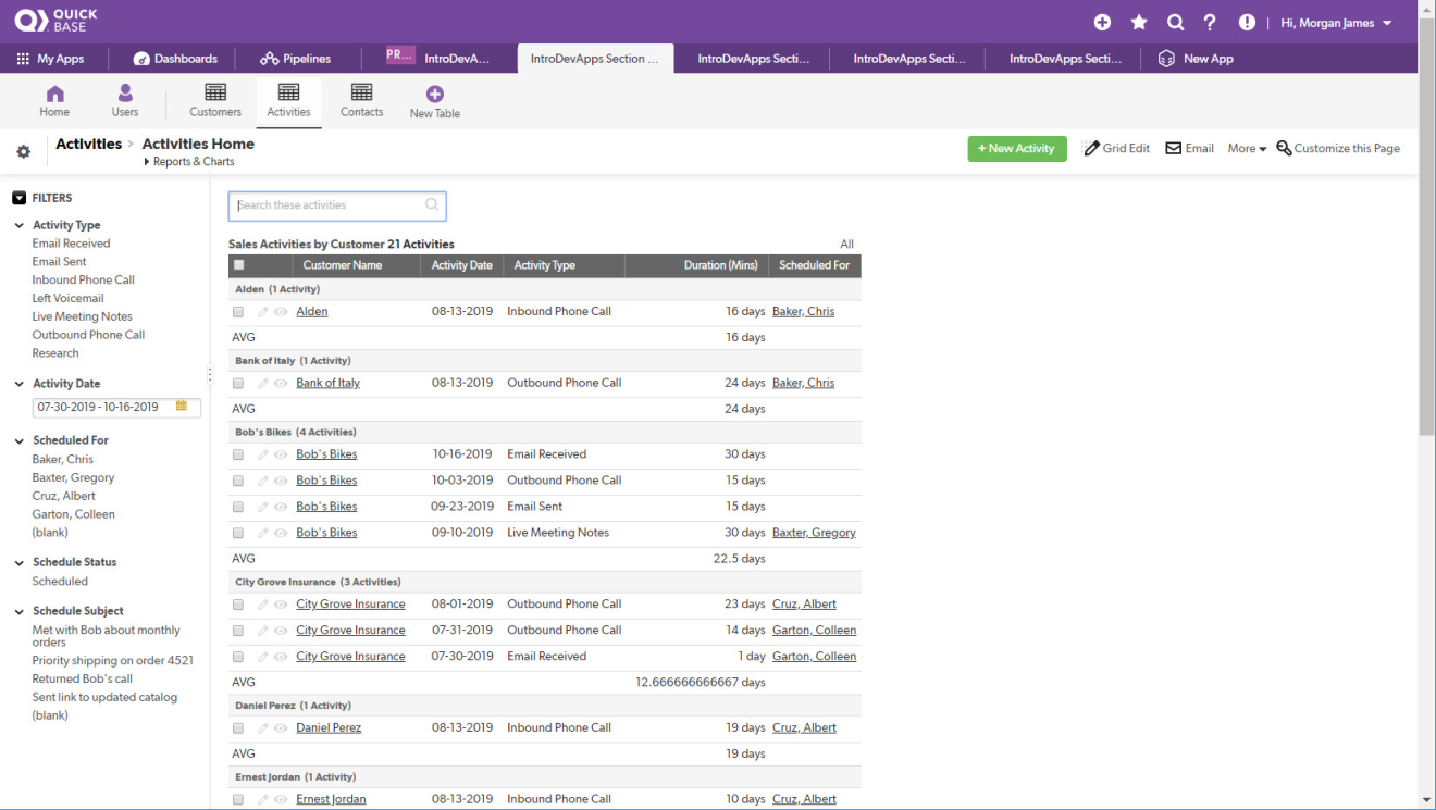 The final Customer Sales Activities app solution after completing the exercises at the end of section 5 of the Introduction to developing Quickbase apps course. The solution includes customized app and table home pages.