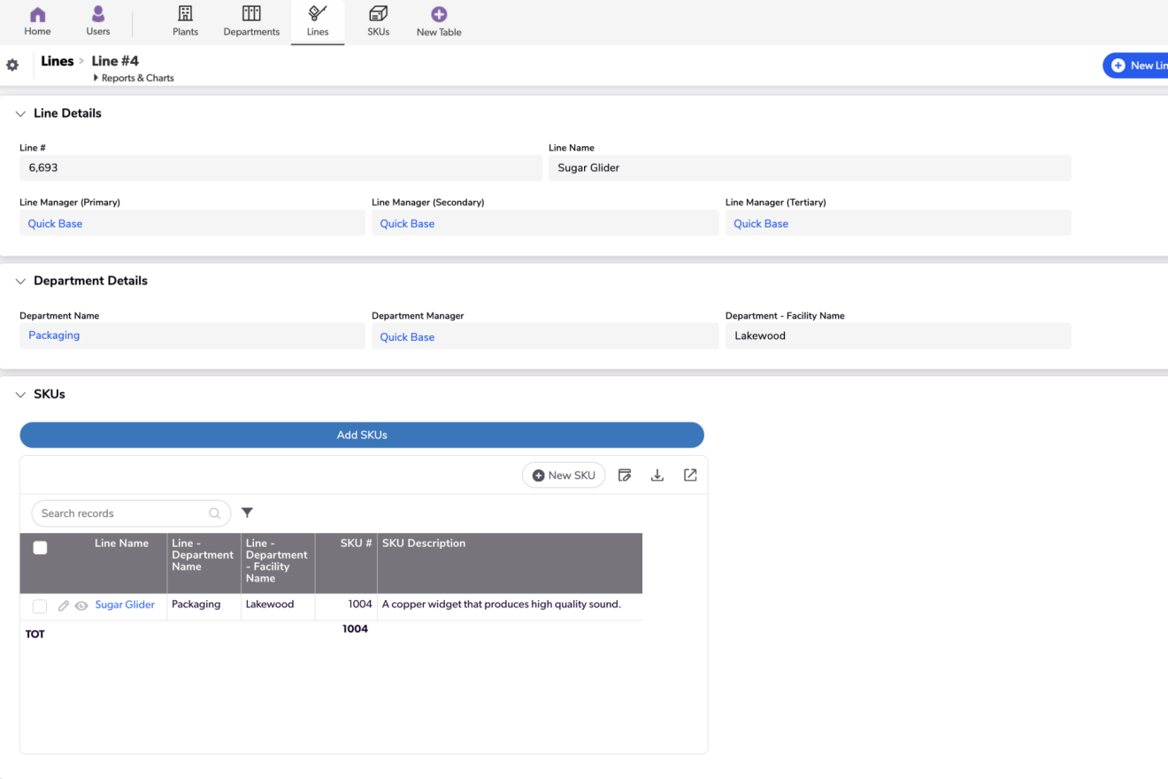 Basic tables for a Plant Manufacturing based app (Plants, Departments, Lines, SKUs)